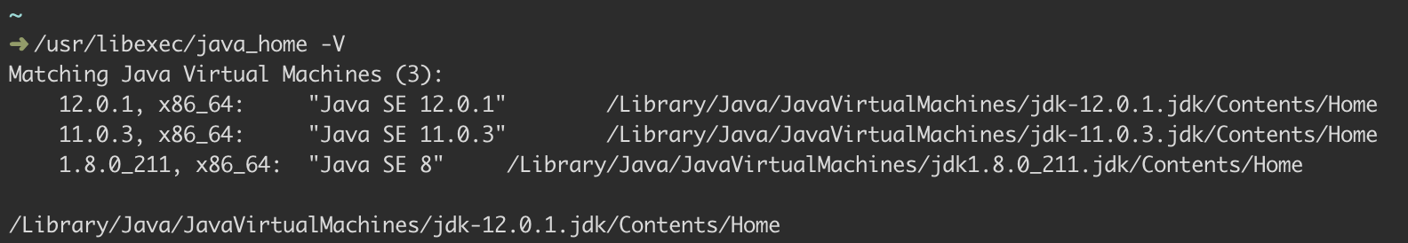 현재 설치 되어있는 자바 버전을 확인 하려면 터미널에 /usr/libexec/java_home -V 입력 하면 현재 설치되어있는 java의 버전이 나옵니다
