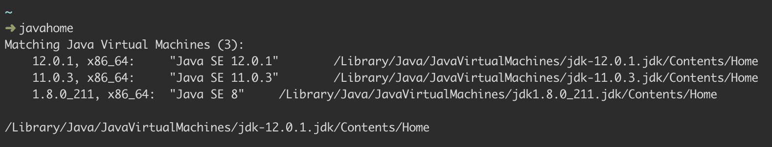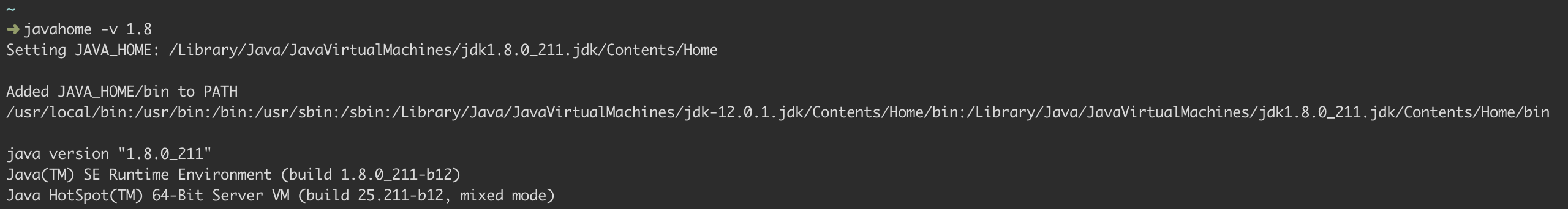 javahome -v 1.8을 적용한 모습입니다. 기본 java 버전이 1.8로 변경되었습니다.