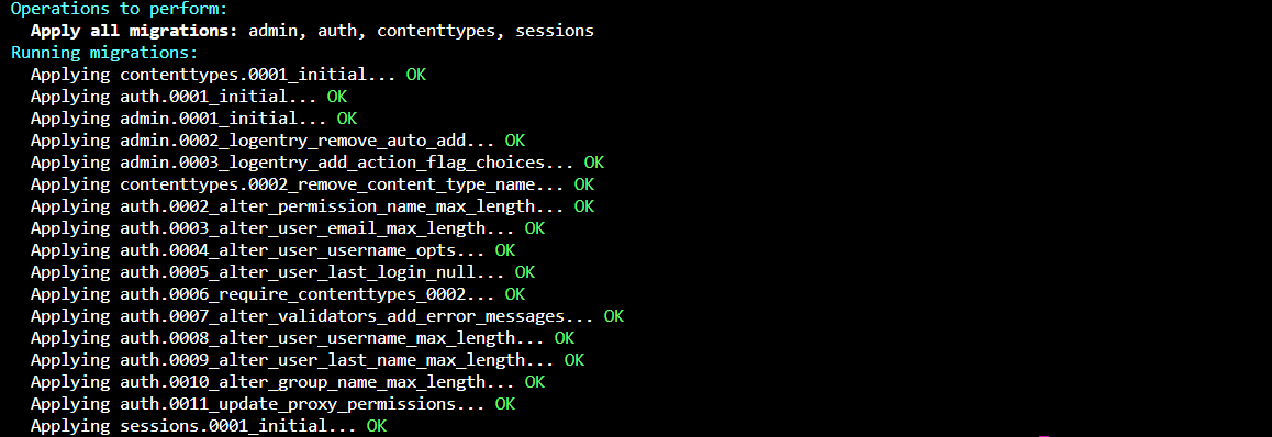 위의 설정까지 모두 마쳤다면, myvenv 경로에서 $ python3 manage.py migrate 를 실행 해 줍니다. 아래와 같이 나오면 migrate이 성공 한 것입니다.
