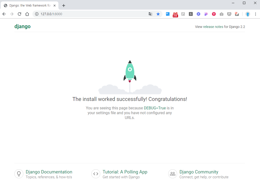 성공적으로 실행 되었을때 나오는 로켓모양의 화면과 "The Install worked successfully! Congratulations!" 를 확인했습니다.