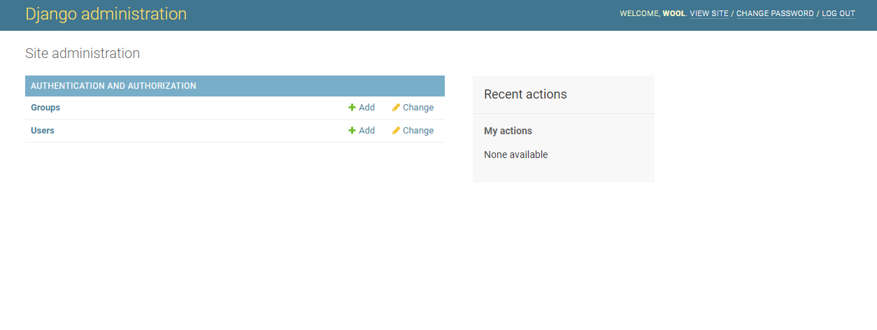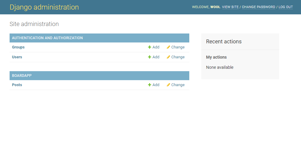 로그인 버튼을 누른 후에 아래와 같은 페이지가 나온다면, admin 계정과 Django admin에 접속이 성공 한 것입니다.